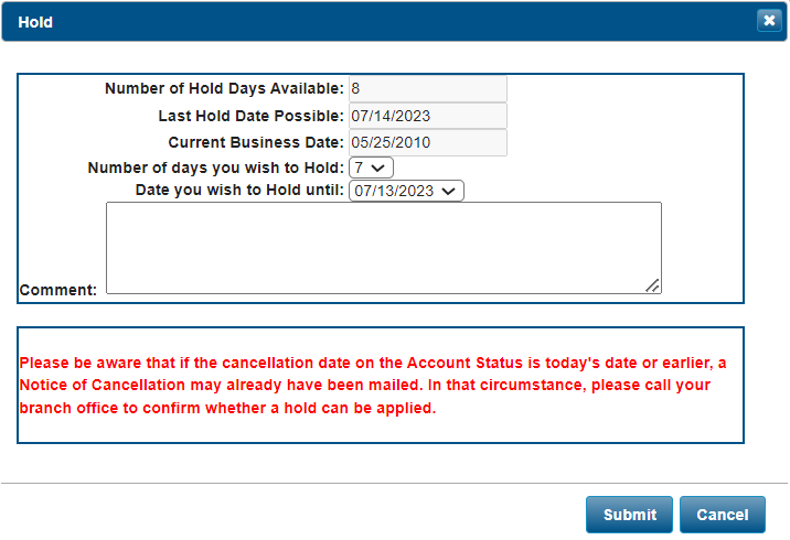 When a payment is anticipated, you can place a delinquent account on "hold". This will prevent cancellation and allow time for the payment to be received and processed by IPFS.