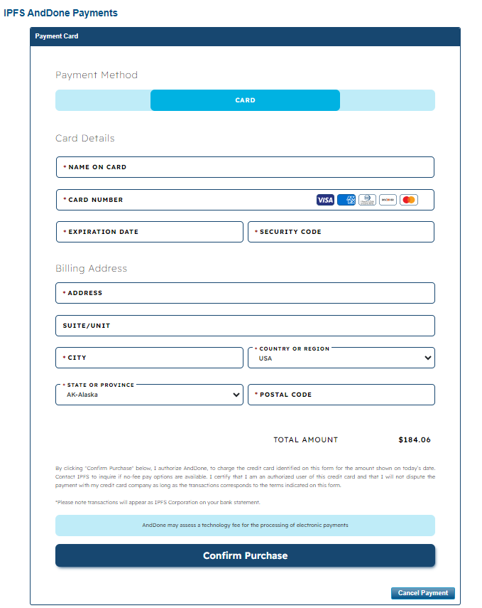 Please note transactions will appear as “IPFS Ins Pmt” on your credit card statement and the technology fee will be appear as PNP-ANDDONE TECH FEE.